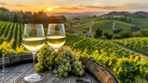 © Oleg, Fototapeta premium Bunch of grapes and two wine glasses on a wooden barrel at sunset, romantic wine tasting setting