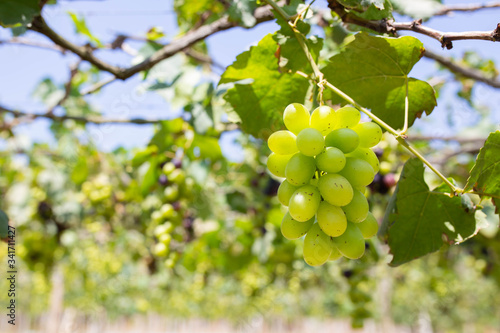 Fototapeta premium Bunch of grapes on a vine yard in the sunshine. The winegrowers grapes on a...