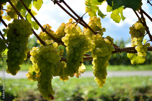 © asbe24, Fototapeta premium Bunch of grapes on the vine with green leaves