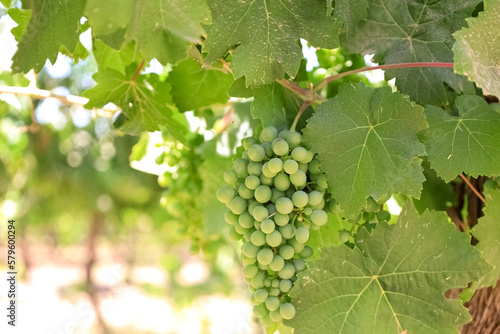 Fototapeta premium Bunch of green grapes in vineyard, closeup