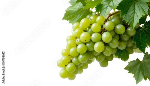 © Hanuman, Fototapeta premium Bunch of green grapes with fresh vine leaves, isolated on a pure white background, high-resolution studio lighting, natural color and texture.