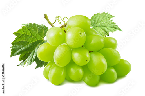 Obraz premium Bunch of green grapes with leaves isolated on white background