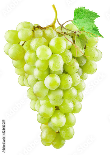 © volff, Obraz premium Bunch of green (yellow) grapes with a grape leaf isolated on a white background. There is a clipping path.