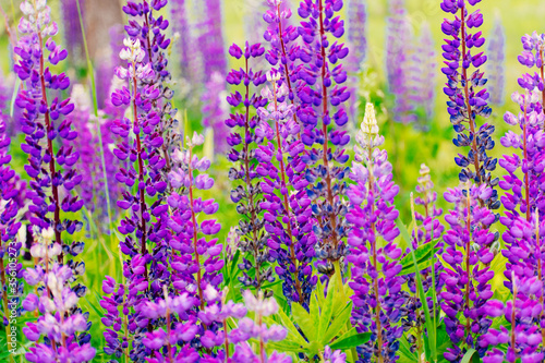 Naklejka premium Bunch of lupines summer flower background. Lupinus, lupin, lupine field with...