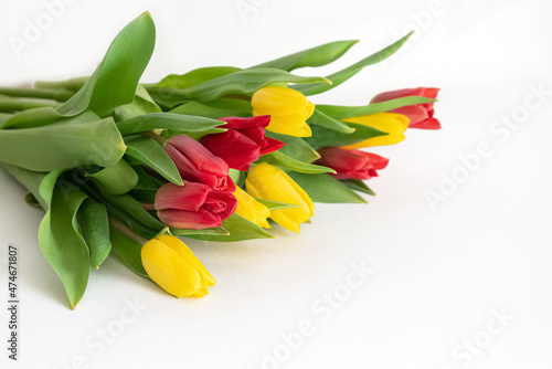© Gioia, Obraz premium Bunch of red and yellow tulips scattered on white background