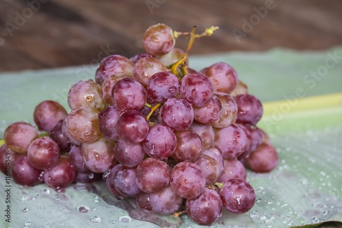 © nirutti, Fototapeta premium Bunch of red grapes , fresh with water drops isolated on banana leaf background , Close up , Low key photo natural light , Focus sharp specific point