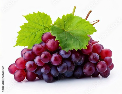 © MdRakibul, Obraz premium Bunch of ripe grapes with grape leaf isolated on a white background.