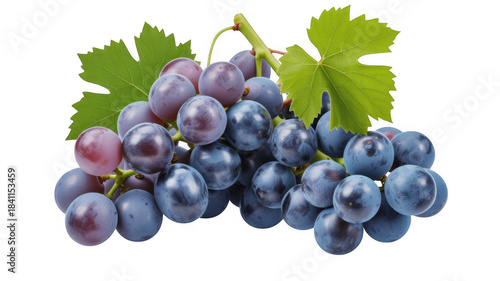 © Seek, Fototapeta premium Bunch of ripe purple grapes with green leaves on a black background isolated on a transparent background