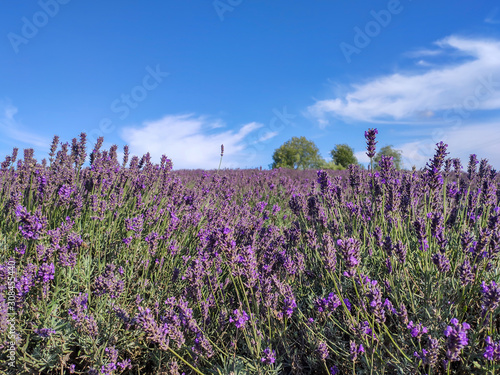 © Uldis, Naklejka premium Bunch of Scented Flowers in the Lavender Field in Latvia. Blue Sky Summer Day.