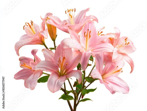 Fototapeta premium Bunch of soft pink lilies with vibrant yellow centers and green stems against white