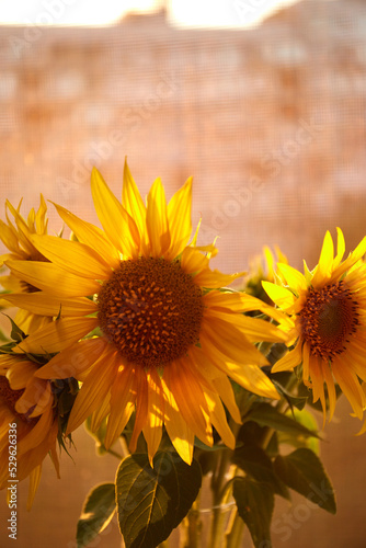© leravalera89, Naklejka premium Bunch of sunflowers in vase on windowsill