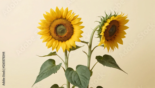 © Aleksandra, Fototapeta premium Bunch of sunflowers tilted towards each other in a corner of a cream pastel background