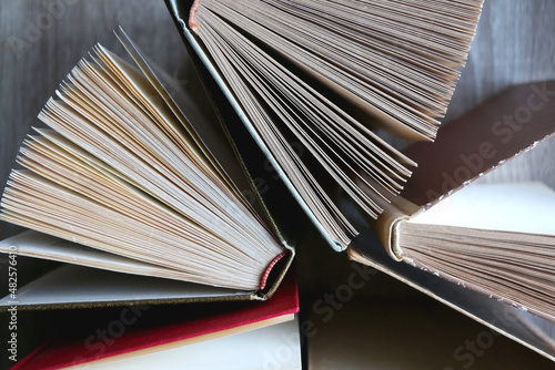 Fototapeta premium Bunch of vintage hardcover books on wooden background. Top view.