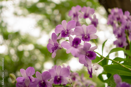 © Arunee, Obraz premium Bunches of purple petals Dendrobium hybrid orchid blossom on dark green leaves blurry background