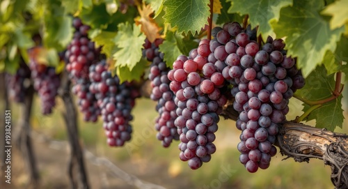 Naklejka premium Bunches of red grapes maturing on sprawling vineyard vines ready for picking