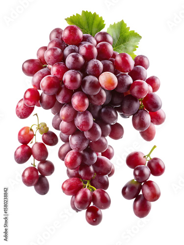 © khaledSaifulllah, Fototapeta premium Bunches of ripe red grapes with green leaves scattered in the air isolated on white isolated on a transparent background