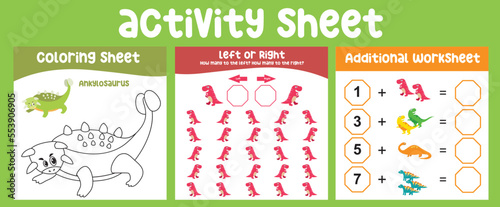 Fototapeta premium Bundle activity kit for toddlers with the prehistoric animal theme. Printable activity worksheet for children with cute Dinosaurs theme. Kawaii vector illustration dino.