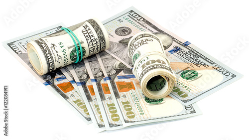 © Pruser, Fototapeta premium Bundle of US 100 dollars bank notes