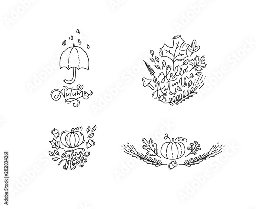 Fototapeta premium Bunlde set of vector illustration monoline calligraphy autumn phrases. Hand drawn autumnal elements pumpkin, umbrella and leaves isolated. Perfect for seasonal holidays, Thanksgiving Day