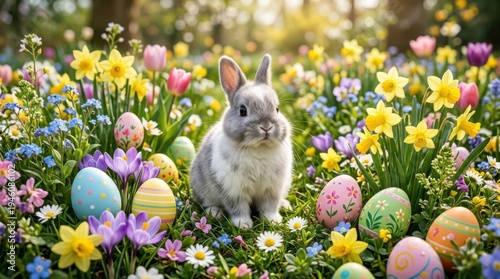 Fototapeta premium Bunny amidst colorful spring flowers and decorated easter eggs