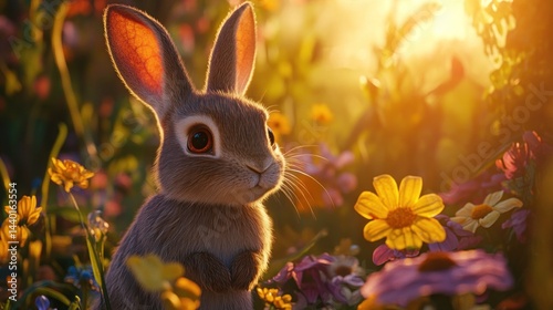 © Rizky, Fototapeta premium Bunny Meadow Sunset, Spring Flowers