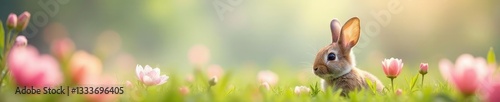 © yuwaree, Fototapeta premium Bunny peeking out from behind a flower with a pink ribbon in the foreground, easter, cute