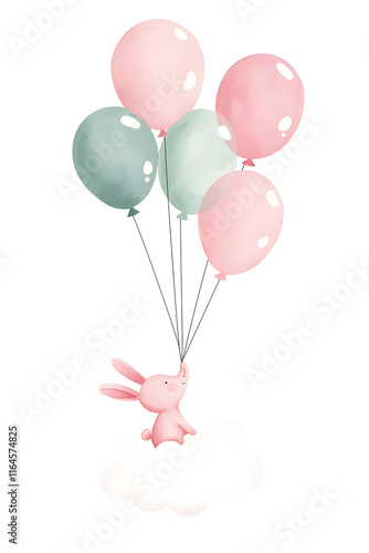 © Oksana_Latysheva, Naklejka premium Bunny with balloons sitting on a cloud, watercolor cute illustration