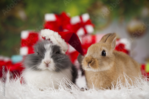 Fototapeta premium Bunny with Rabbit, christmas red Santa hat on winter decoration