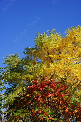 Naklejka premium Bunte Baumlandschaft im Herbst bei Sonnenschein und blauem Himmel