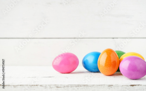 Obraz premium Bunte Ostereier vor weißem Holzhintergrund