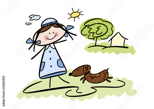 Fototapeta premium Bunte Zeichnung: Fröhliches Mädchen mit Hund