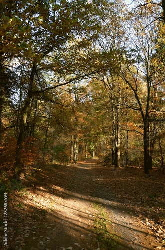 © alisseja, Fototapeta premium Bunter Herbstwald mit langen Schatten auf Waldweg