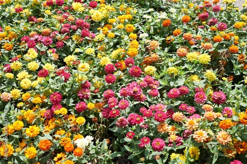 Naklejka premium Buntes Blumenbeet - Dahlien gelb, orange, rot, weiß