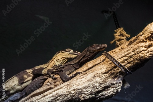 © Vanell, Fototapeta premium Buntwarane liegen aufeinander auf einem Baum