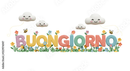 Obraz premium Buongiorno Pastel Floral Illustration with Cute Bees and Clouds