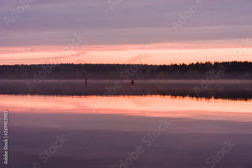 © Riwkus, Fototapeta premium Buoy-enclosed fairway in the evening during a pink sunset