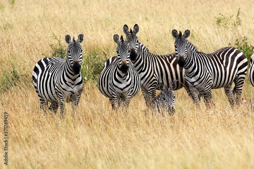 Fototapeta premium Burchell's Zebra, equus burchelli, Herd at Masai Mara Park in Kenya