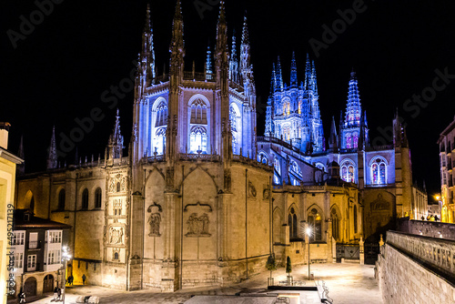 Fototapeta premium Burgos Cathedral with people and tourists walking past in the square next to...