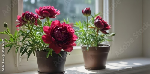 © tpadobestock, Fototapeta premium Burgundy peony bud on windowsill, potted blooms nearby , window, spring, peaceful