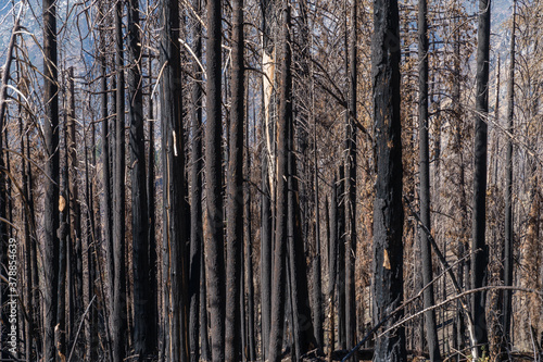 Obraz premium Burned and blackened trees after forest fire in California.