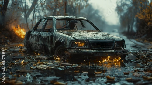 © BlueJay, Fototapeta premium Burned car burning on a flooded road after war or riot