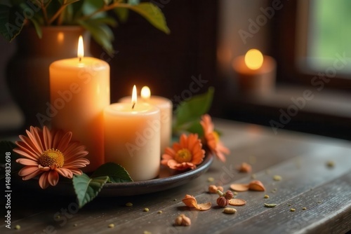 Obraz premium Burned-down candles, dried flower accents, wooden table, candle, leaves, ambiance