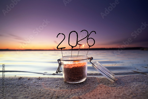 Obraz premium Burned down 2026 Sparklers in a Glass by the Sea
