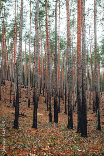 Obraz premium Burned tree trunks after forest fires