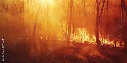 © AkuAku, Fototapeta premium Burned trees in a Deciduous Forest fire caused by a wildfire leading to pollution and smoke