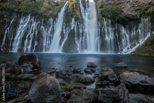 © Mike Lee, Fototapeta premium Burney Falls in early dawn light with stones in the foreground.