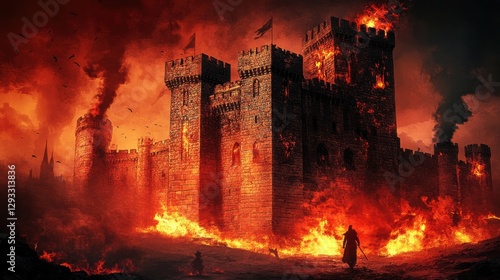 © Валерий Тодаренко, Fototapeta premium Burning ancient castle illuminated by glowing embers under a dark red sky, symbolizing destruction and chaos, shadows of fleeing figures
