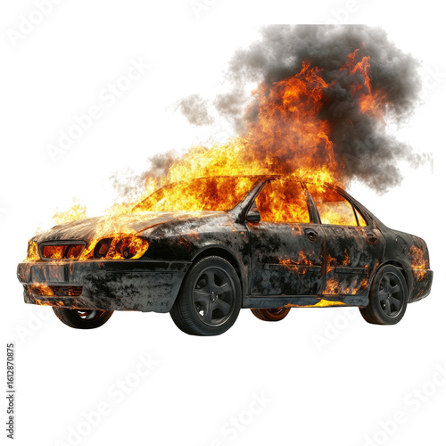 © Htmmehedi427, Obraz premium Burning Black Sedan Car engulfed in Flames isolated on a transparent background burning car