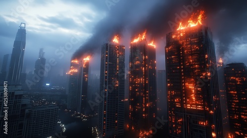 © QuietWord, Fototapeta premium burning city in flame fire and smoke at night time