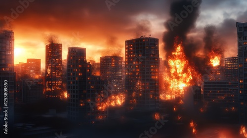 © QuietWord, Obraz premium burning city in flame fire and smoke at night time